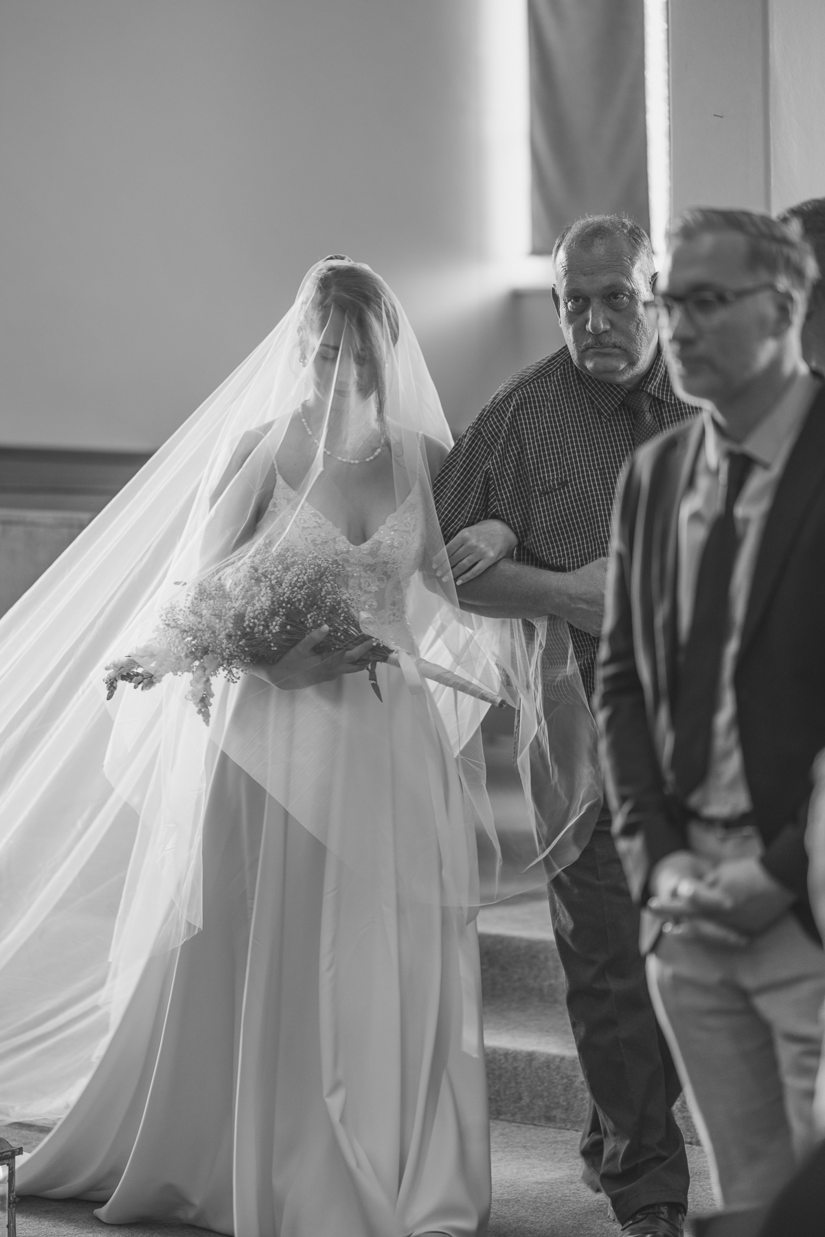 DJ & Roline het ‘n First Look gedoen en die baie groot opgewondenheid en senuwees kon tot bedaring kom – of ek dink so. DJ het soos ‘n prins geglimlag to Roline aan haar Pa se arm die kerk instap. Sy bruid was oppad.